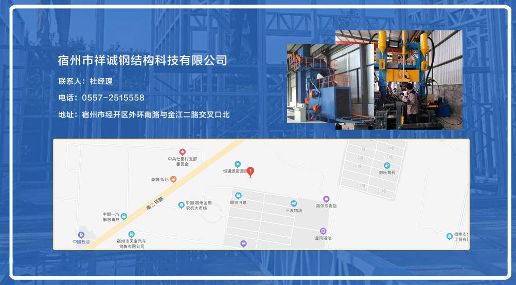 祥誠(chéng)鋼結(jié)構(gòu)       宿州市祥誠(chéng)鋼結(jié)構(gòu)科技有限公司位于宿州市經(jīng)開(kāi)區(qū)外環(huán)南路與金江二路交叉口北,公司是一家以建設(shè)產(chǎn)業(yè)化為目標(biāo),匯集大型鋼結(jié)構(gòu)廠(chǎng)房、彩鋼活動(dòng)房設(shè)計(jì)、制作、安裝施工一條龍服務(wù)的知名鋼結(jié)構(gòu)公司。公司現(xiàn)有固定資產(chǎn)1000余萬(wàn)元、流動(dòng)資金近千萬(wàn)元公司?,F(xiàn)有員工40人,大專(zhuān)以上學(xué)歷30人,其中高級(jí)工程師1人、工程師2人、會(huì)計(jì)師1名。各工種持證上崗率100%。高效化的年青團(tuán)隊(duì)為公司帶來(lái)了蓬勃發(fā)展的動(dòng)力,全體員工以務(wù)實(shí)的態(tài)度,拼搏的精神,創(chuàng)造著企業(yè)的每一天。      公司組織結(jié)構(gòu)嚴(yán)格按現(xiàn)代企業(yè)制度設(shè)計(jì),管理機(jī)構(gòu)設(shè)置合理,制度完善,各部門(mén)分工明確...